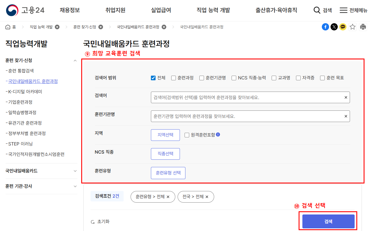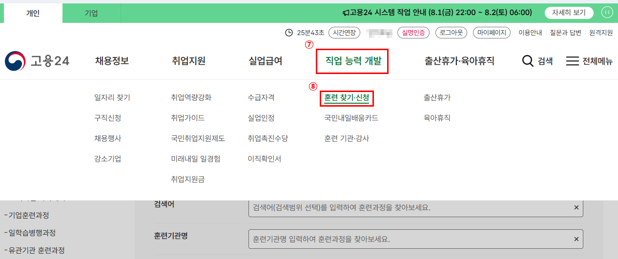 - 로그인 후 상단 카테고리 「 직업 능력 개발 」의 하위메뉴 「 훈련 찾기 · 신청 」 선택