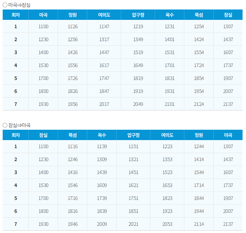 [마곡] -[망원] - [여의도] - [압구정] - [옥수] - [뚝섬] - [잠실] 총 7개의 선착장이 있고 총 28.9km를 운항한다고 합니다.