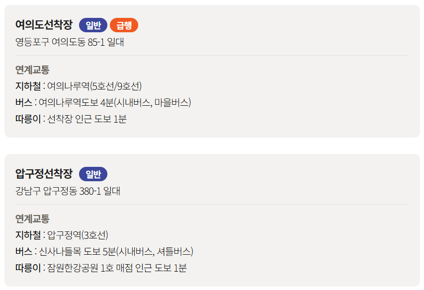 | Q3. 선착장까지 가는 교통이 불편하지는 않나요? | 서울시는 선착장 인근 버스 노선 신설·조정, 따릉이 대여소 설치, 일부 선착장에 무료 셔틀버스 운영 등으로 접근성 개선 중입니다. |