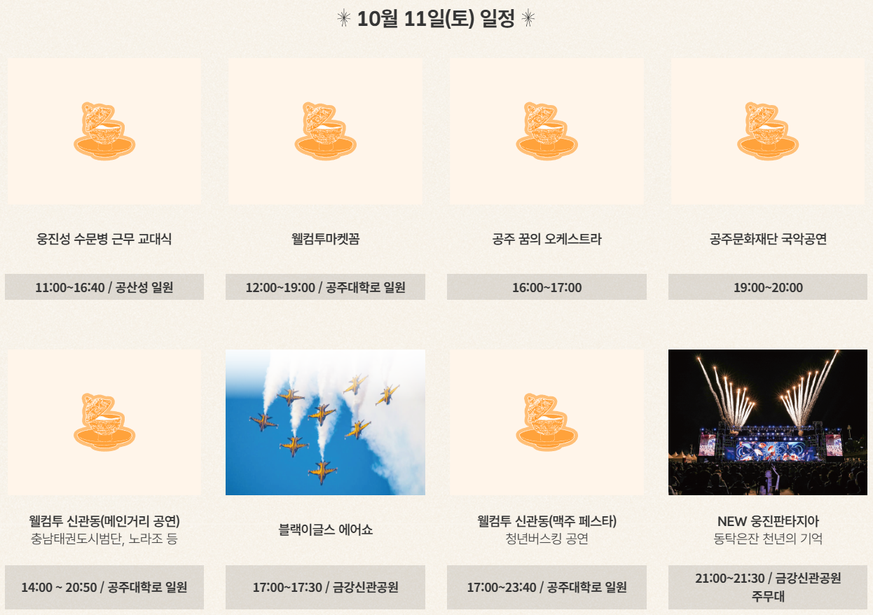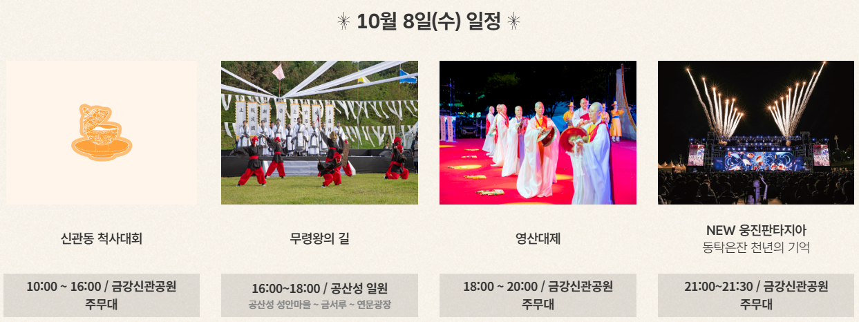 행사장이 여러 곳(금강신관공원, 공산성, 왕도심 등)에 분산돼 있으므로, 주요 보고 싶은 프로그램 중심으로 이동 계획 세우는 것이 좋습니다.