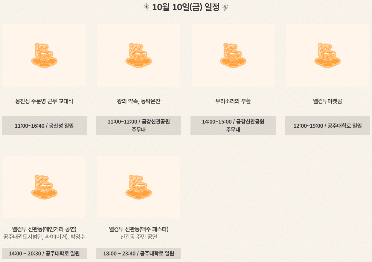 • 맛집 & 특산품 : 공주 알밤 관련 제품, 향토 음식, 길거리 간식 등. 축제장 주변 및 시내 식당 미리 조사해 두면 시간 절약됨