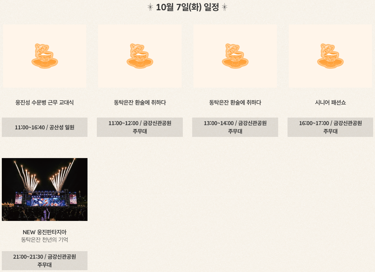 | 공식/대표 프로그램 | 개막식, New 웅진판타지아, 왕궁 퍼레이드, 웅진성 퍼레이드 등 |