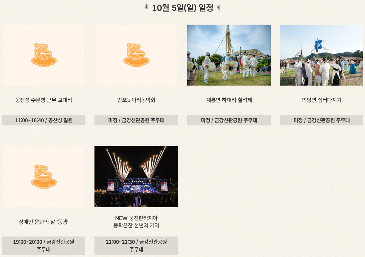 | 공식/대표 프로그램 | 개막식, New 웅진판타지아, 왕궁 퍼레이드, 웅진성 퍼레이드 등 |